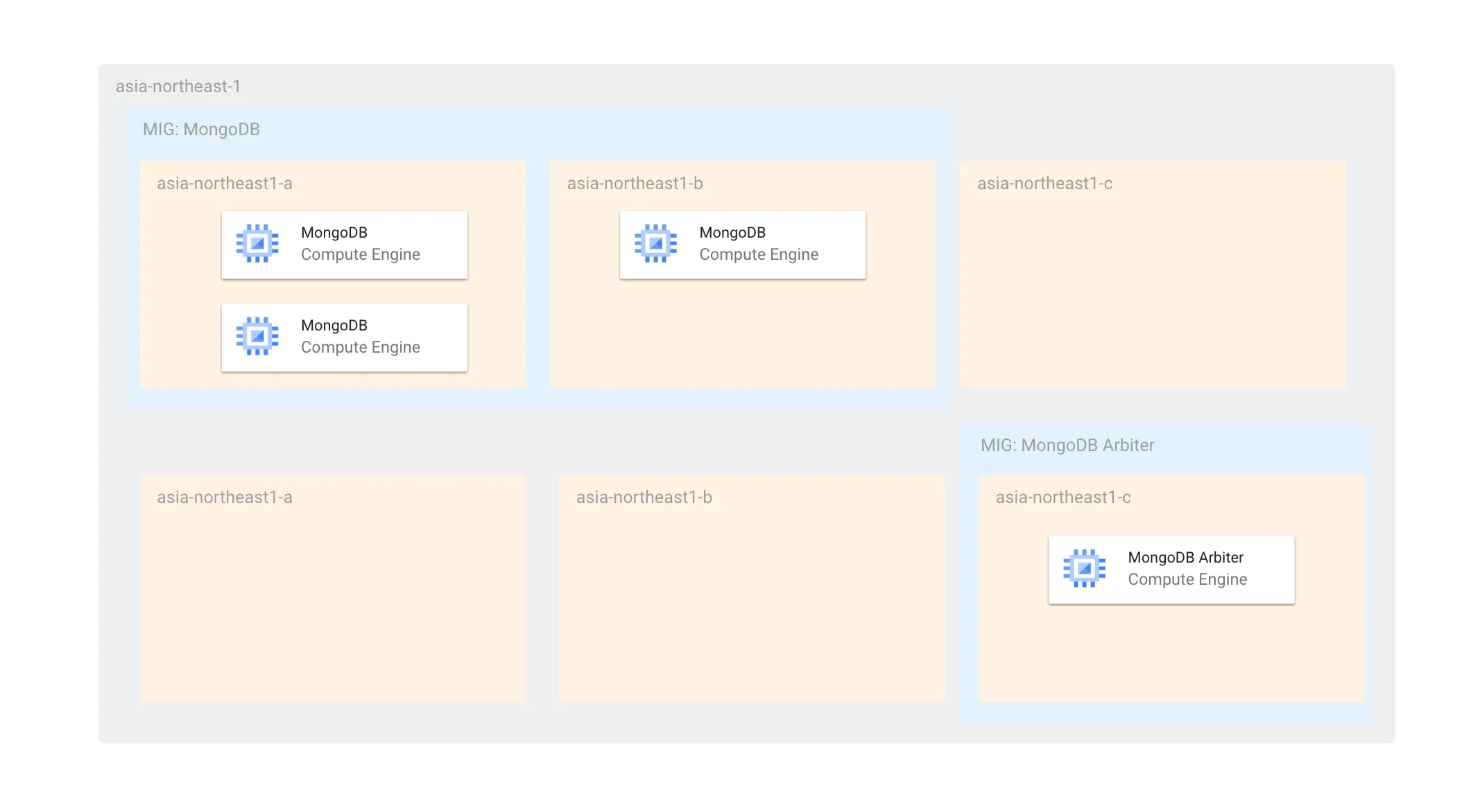 The configuration is also resilient to single-zone failures. During a failure, the Arbiter and the remaining MongoDB can elect a primary. By setting the MIG topology to EVEN, we ensure that instances are not concentrated in a single zone.